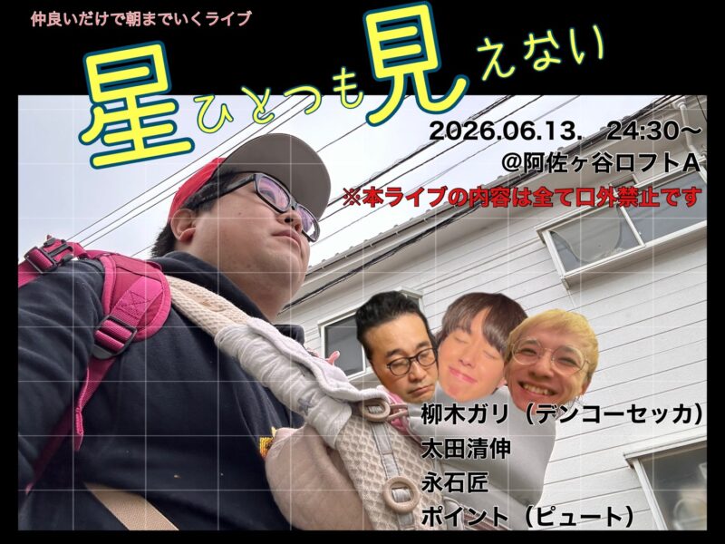 A Live Performance That Goes Until Morning Just From Getting Along: 'Not a Single Star Visible' is an all-night performance event scheduled for June 2026 in Tokyo. The title suggests an immersive theatrical or musical experience that extends from evening through dawn, creating an endurance-based artistic encounter. The poetic title 'Not a Single Star Visible' evokes urban themes of light pollution and disconnection from nature, common motifs in contemporary Japanese performance art. This type of extended-duration performance challenges conventional theater formats and audience stamina.