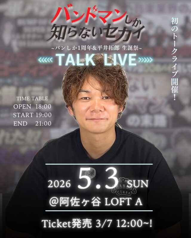 A talk live event celebrating the first anniversary of Banshika and the birthday of Takuro Hirai, a bandman in the Japanese music scene. The event promises insider perspectives on the world of bandmen, likely featuring anecdotes, discussions, and behind-the-scenes stories from musicians active in Japan's live music circuit. This type of talk event offers fans direct access to artists in a more intimate, conversational setting than typical concerts. The format appeals to those interested in the personalities and experiences behind the music.