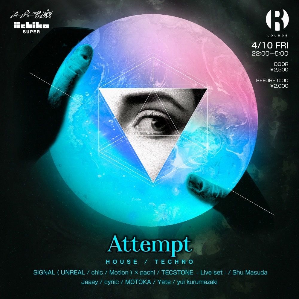 Attempt is a house and techno night featuring eight DJs and live acts in Tokyo's electronic music scene. The lineup includes SIGNAL, Shu Masuda, Jaaay, cynic, MOTOKA, Yate, yui kurumazaki, and TECSTONE Live. This is a dedicated electronic music event focused on house and techno genres. The event enforces a strict 20+ age policy with mandatory photo ID verification at entry.