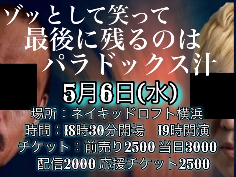This is a performance or theatrical event with an enigmatic title that suggests an experimental or avant-garde nature. The cryptic name 'I shudder and laugh, and what remains in the end is paradox juice' indicates a contemporary art piece, likely involving physical theater, spoken word, or multimedia performance. Without additional source material, the specific content and format remain unclear, though the title's philosophical tone suggests an introspective or absurdist work. The evening timing categorizes it as a nightlife event in Tokyo's contemporary arts scene.