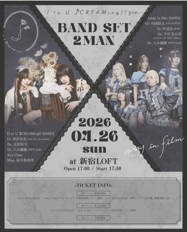 I to U $CREAMing!! pre. BAND SET 2MAN 「X」 is a two-band live music event (2MAN) taking place in Tokyo. The title suggests this is part of the I to U $CREAMing!! series, with this particular show being a pre-event featuring a band set format. Two-man shows are a popular format in Japan's live music scene where two bands or artists share equal billing and perform full sets. The 「X」 in the title likely refers to the specific pairing or theme of this particular edition.