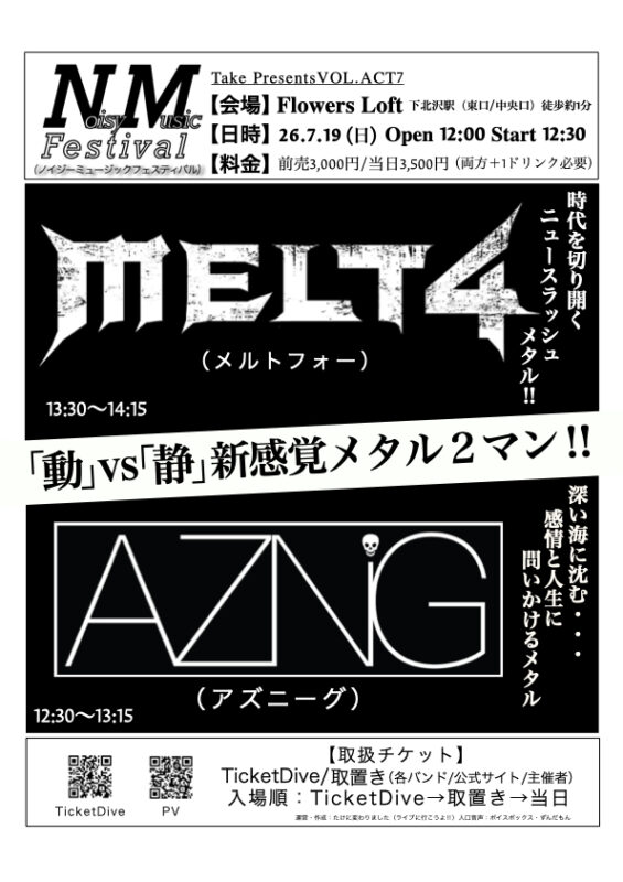 Noisy Music Festival vol.7 is the seventh edition of a recurring music event in Tokyo focused on loud, high-energy musical performances. The festival's name suggests a celebration of amplified sound and intense sonic experiences, likely featuring rock, metal, punk, or experimental electronic acts. As a numbered volume event, it has established itself as a regular fixture in Tokyo's alternative music scene. The festival provides a platform for both established and emerging artists working in heavier or more abrasive musical genres.