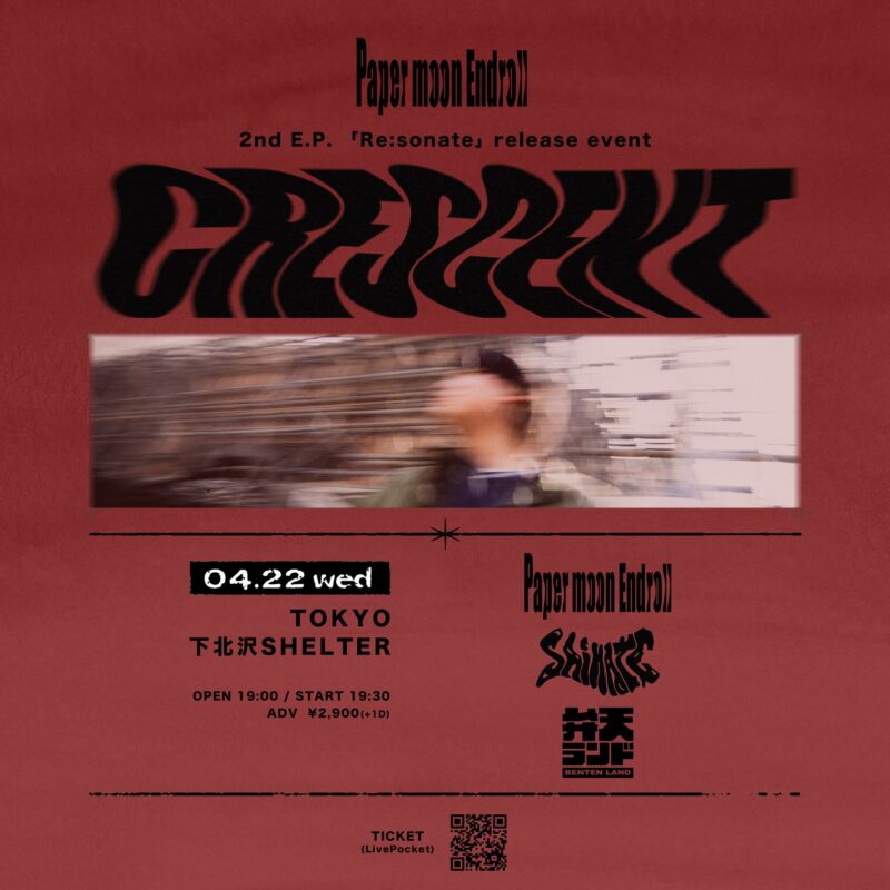 Paper moon Endroll is hosting a release event for their second EP titled 'Re:sonate' at a Tokyo venue. The event, named 'CRESCENT', celebrates the launch of new music from this Japanese artist or group. Release events in Tokyo's music scene typically feature live performances of the new material alongside fan interaction opportunities. These intimate gatherings allow supporters to experience new releases in a dedicated concert setting before wider distribution.