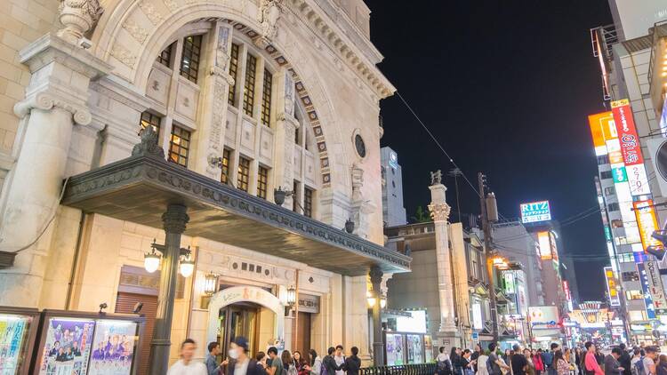 The Shochiku-za in Osaka's Dotonbori district hosts kabuki several times annually. Osaka has its own distinct kabuki tradition — Kamigata kabuki — which differs from the Edo style primarily in its emphasis on domestic realism and psychological nuance over heroic spectacle. The Osaka tradition produced wagoto, a gentle, romantic male performance style that contrasts sharply with the bombastic aragoto style developed in Edo. This theatre is holding its last performance in May 2026 although the theatre may be rebuilt.
